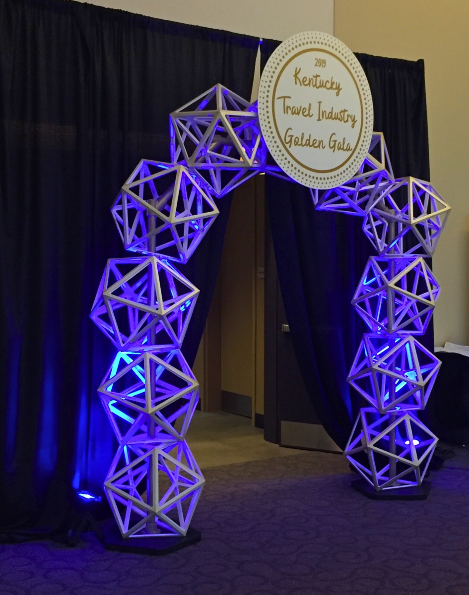 Queen City Destination came to us in need of a show stopping archway to welcome guests into the Kentucky Travel Industry Association’s 2019 Golden Gala reception.They needed a show stopping archway that had a fast set up and tear down time, and they wanted it to look very similar to the geometric shaped wire centerpieces that they were using inside the reception.Working Studio worked with Queen City Destination to help make their vision come to life giving the Golden Gala it’s“WOW” factor for guests when they entered the ballroom.